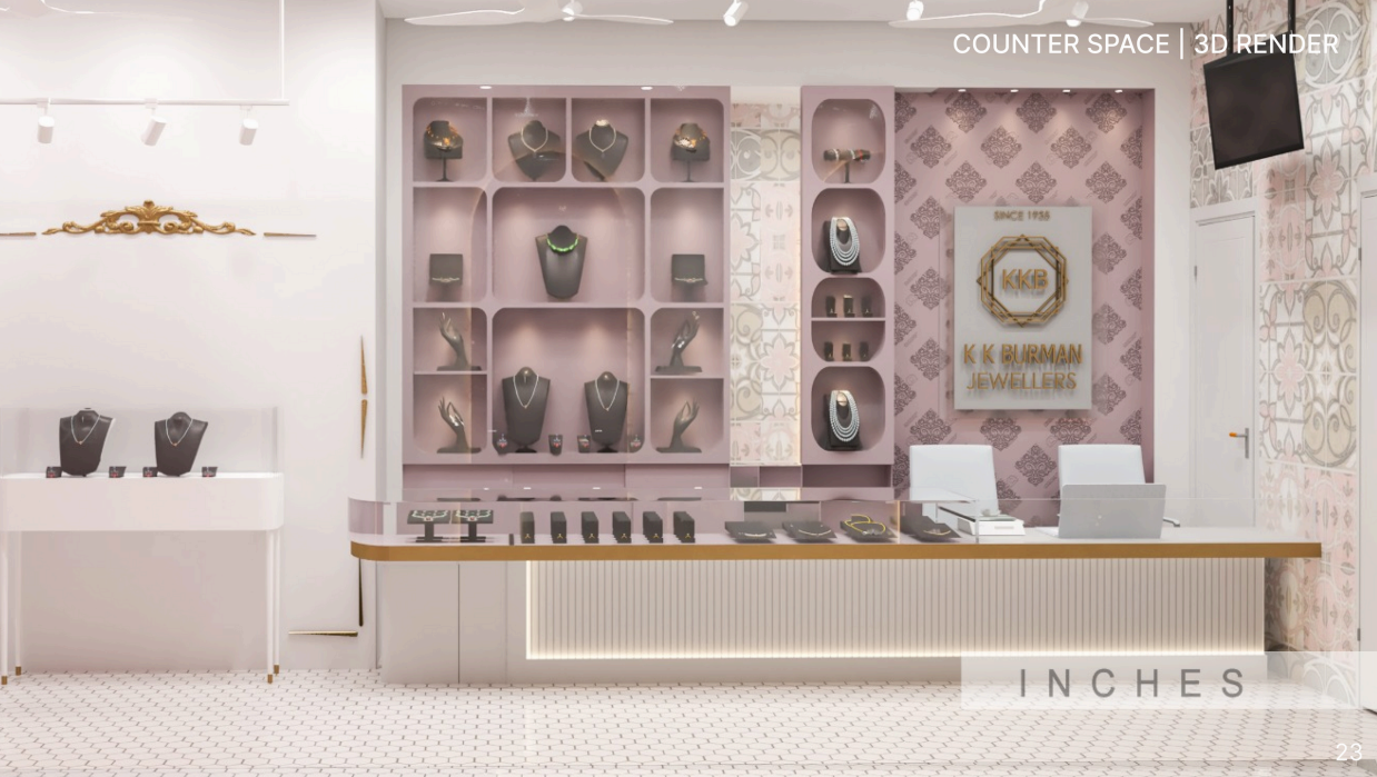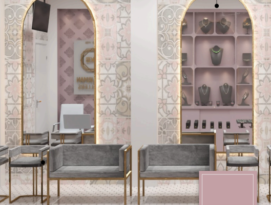 This jewelry store exudes royal elegance with Mughal-inspired prints and patterns, complemented by modern chic furniture. Every element is carefully curated to create a luxurious and inviting ambiance, offering an exquisite shopping experience that reflects the opulence of the Mughal era.