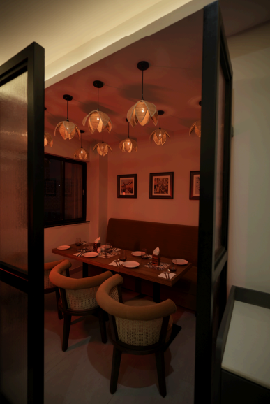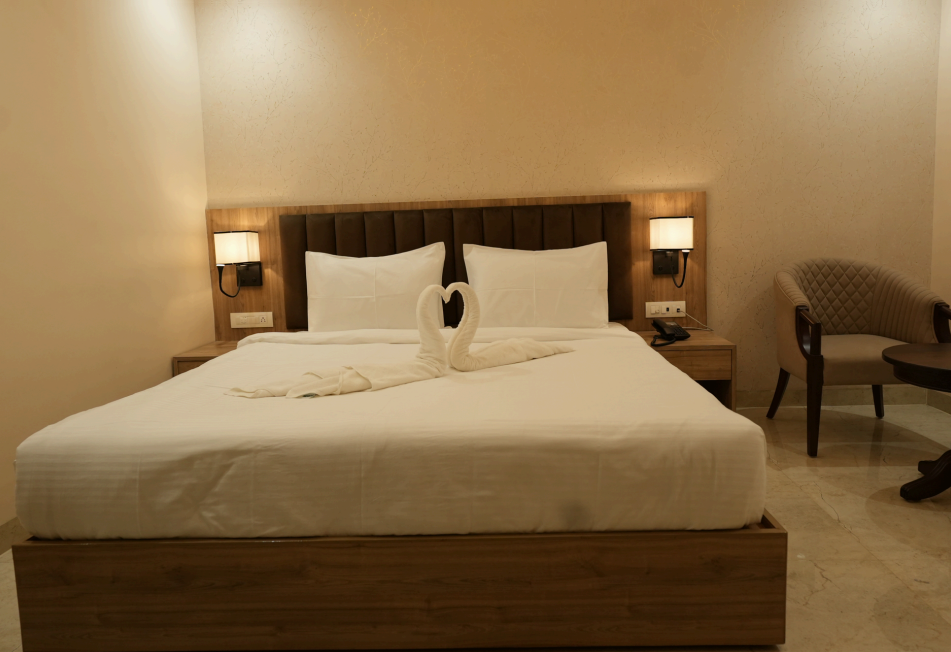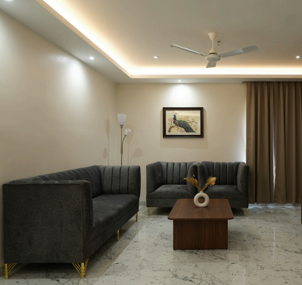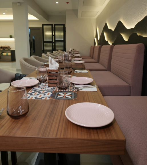 A sophisticated corporate boutique hotel exuding elegance. its palette seamlessly merge the lightest hues with the deepest shades, creating a harmonious blend. the space is curated with our meticulously crafted space, blemding vinesgwar tiles for flooring, Asian paints' PU work on the wall and plywood mart laminate for timeless elegance
