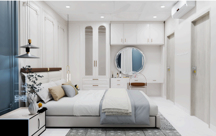 The son's 180-square-foot bedroom is uniquely designed to stand out from the rest Of the house. It features PU paint finishes, a back wall with POP molding and enamel spray paint, and HDHMR wardrobes with PU finishes. Glossy white carpeting adds contrast, and the table doubles as a dressing and study area.